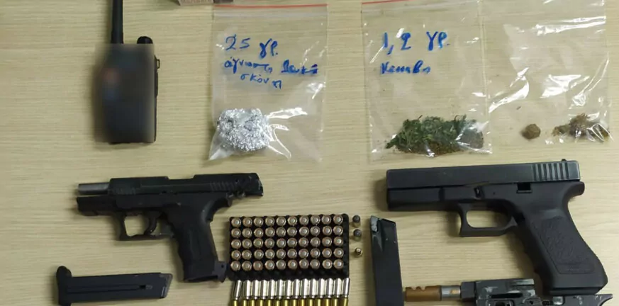 Άνδρας βρέθηκε με χειροπέδες, καθώς σε έλεγχο της Αστυνομίας βρέθηκαν στην κατοχή του ναρκωτικά και όπλα, ακόμα και ένας φορητός ασύρματος, συντονισμένος στη συχνότητα της ΕΛΑΣ.