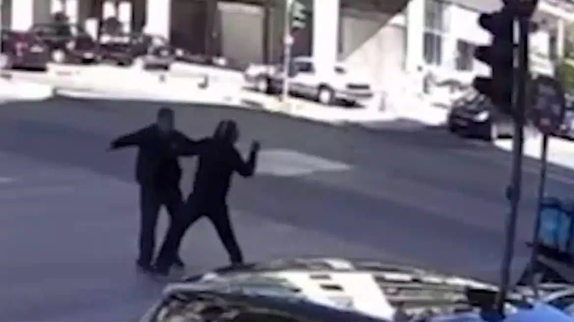 Στο βίντεο-ντοκουμέντο που παρουσιάζει το protothema.gr διακρίνονται οι δύο οδηγοί να παίζουν στην κυριολεξία «μποξ» κάτω από το φανάρι και ο αναβάτης της μηχανής να βγάζει το κράνος για να χτυπήσει τον ηλικιωμένο.