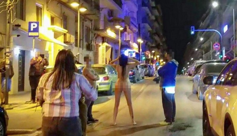 Μια γυμνή γυναίκα στη μέση της οδού Κασσάνδρου αντίκρισαν οδηγοί και περίοικοι το βράδυ του Σαββάτου στη Θεσσαλονίκη.