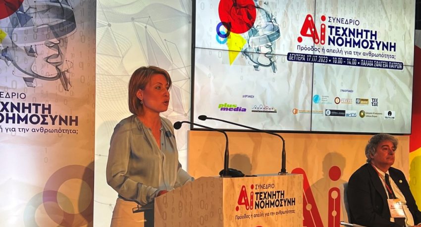 Στην αξιοποίηση των δυνατοτήτων που παρέχει η Τεχνητή Νοημοσύνη για την βελτίωση των υπηρεσιών του κράτους αναφέρθηκε η Υφυπουργός Υποδομών και Μεταφορών, αρμόδια για τις μεταφορές, Χριστίνα Αλεξοπούλου, από το βήμα του συνεδρίου με τίτλο «Τεχνητή Νοημοσύνη: Πρόοδος ή απειλή της ανθρωπότητας», που διοργανώθηκε από τον όμιλο Plus Media και την Αστική Μη Κερδοσκοπική Εταιρεία Κύμανση, με συνδιοργανωτές την Περιφέρεια Δυτικής Ελλάδας, το Πανεπιστήμιο Πατρών, το Επιμελητήριο Αχαΐας, το Οικονομικό Επιμελητήριο Βορειοδυτικής Πελοποννήσου και Δυτικής Ελλάδας, το Τμήμα Δυτικής Ελλάδας του Τεχνικού Επιμελητηρίου Ελλάδας, τον Εμπορικό και Εισαγωγικό Σύλλογο Πατρών και τον Σύνδεσμο Επιχειρήσεων και Βιομηχανιών Πελοποννήσου και Δυτικής Ελλάδας, με την τεχνική υποστήριξη της ΚΕΔΗΠ, στην πόλη της Πάτρας.