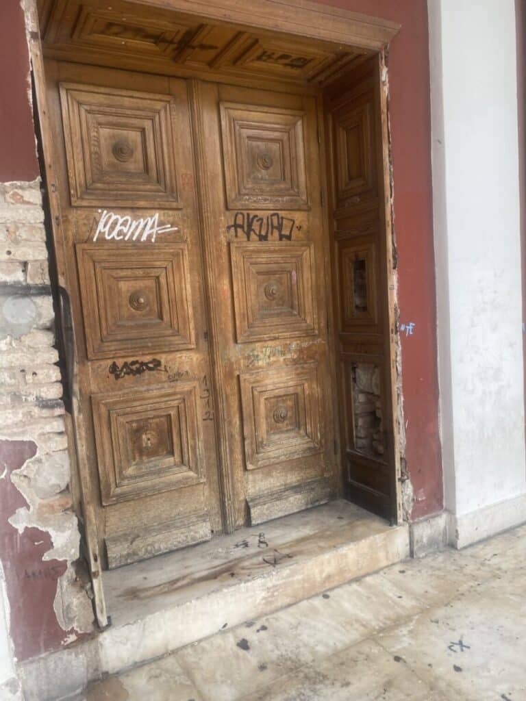 Η πρόσοψη του κτιρίου, αλλά και οι στοές που οδηγούν στην είσοδο του θεάτρου, είναι καλυμμένες με συνθήματαγκράφιτικολλημένες αφίσες και μπογιές. Κανείς δεν έχει φροντίσει να αποκαταστήσει τη ζημιά, και τα σημάδια της εγκατάλειψης είναι πλέον μόνιμα. Οι εντυπωσιακές ξύλινες πόρτες του θεάτρου – πραγματικά έργα τέχνης – είναι λερωμένεςσπασμένες σε σημεία και καλυμμένες με αφίσες και αυτοκόλλητα. Κάποια από τα σκαλιστά μέρη έχουν φθαρεί από την υγρασία ή και από ανθρώπινη παρέμβαση. Οι κολώνες και οι τοίχοι γύρω από την είσοδο είναι γεμάτοι μπογιές και απρεπή συνθήματα, ενώ σε αρκετά σημεία βλέπει κανείς και ίχνη καύσης, πιθανώς από αναμμένα αντικείμενα ή σκουπίδια που κάηκαν εκεί.