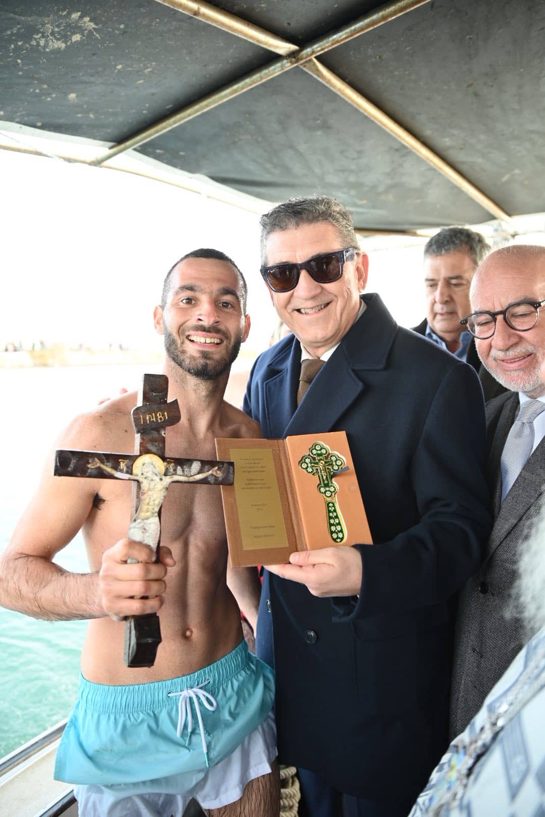 Τον Σταυρό κατάφερε να ανασύρει από τη θάλασσα ο Θανάσης Κυριακόπουλος από τις Αλυκές, στον οποίο ο Δήμαρχος παρέδωσε ένα αναμνηστικό δώρο και παράλληλα συνεχάρη όλους τους συμμετέχοντες για την πίστη και το θάρρος τους και ευχαρίστησε τον ΣΕΔΙΠ Δυτικής Αχαΐας για την ναυαγοσωστική κάλυψη.