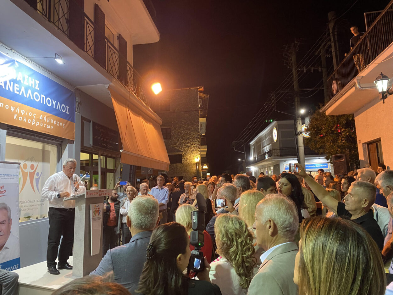 Ο υποψήφιος Δήμαρχος Θανάσης Κανελλόπουλος, απευθυνόμενος στο πλήθος που είχε συγκεντρωθεί από νωρίς, έστειλε ηχηρό μήνυμα αλλαγής στο Δήμο Καλαβρύτων, αναφέροντας μεταξύ άλλων πως «οι προσεχείς δημοτικές εκλογές είναι ζωτικής σημασίας για τον τόπο μας. Η νέα Δημοτική Αρχή θα κληθεί να οδηγήσει το Δήμο μας σε μια νέα εποχή που δεν θα είναι καθόλου εύκολη. Με θάρρος και αποφασιστικότητα, στοχεύουμε σε μια συνεκτική κοινωνία, που δημιουργεί σχέσεις εμπιστοσύνης μεταξύ πολιτών και Δημοτικής Αρχής, σε έναν Δήμο σχεδιασμένο να ικανοποιεί τις ανάγκες της κοινωνίας και των δημοτών και να ανταποκρίνεται στις σύγχρονες απαιτήσεις».