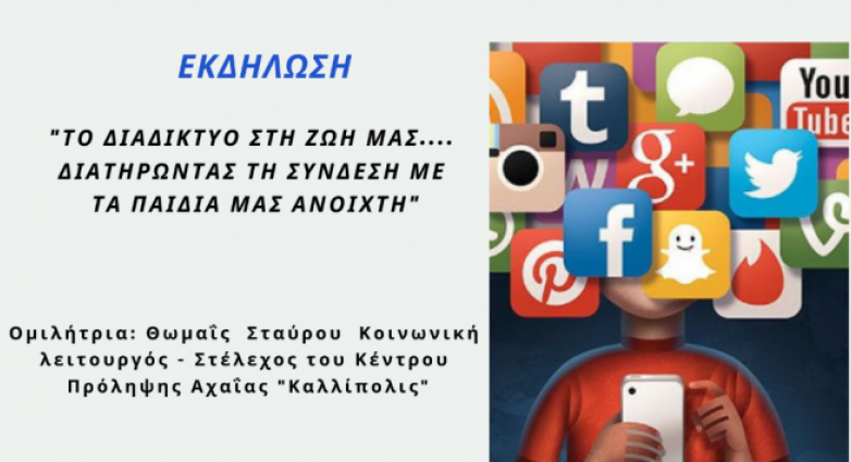 Το Κέντρο Πρόληψης των Εξαρτήσεων και Προαγωγής της Ψυχοκοινωνικής Υγείας Π.Ε. Αχαΐας Καλλίπολις και ο Δήμος Δυτικής Αχαΐας διοργανώνουν εκδήλωση με θέμα: «Το Διαδίκτυο στη ζωή μας, διατηρώντας τη σύνδεση με τα παιδιά μας ανοιχτή.»