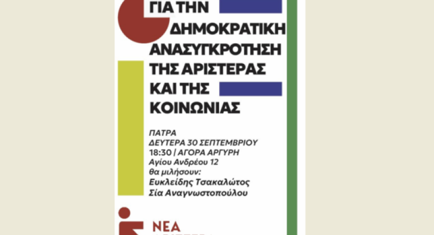 Η “Νέα Αριστερά”, ενόψει του προγραμματισμένου συνεδρίου της, 7 με 10 Νοέμβρη στην Αθήνα, ξεκινά τον προσυνεδριακό της διάλογο στην Αχαΐα με ανοικτή εκδήλωση-συζήτηση, την Δευτέρα 30 Σεπτέμβρη και ώρα 18:30 στην Αγορά Αργύρη, Αγίου Ανδρέου 12.