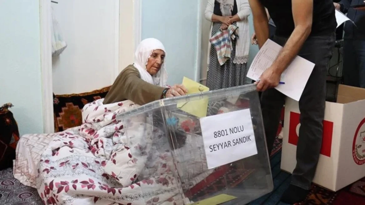Οι υπάλληλοι του εκλογικού τμήματος πήραν τη φορητή κάλπη και την πήγαν στο σπίτι των Ερδίλ και Σουμεγιέ Σαχίν, δίνοντας πληροφορίες για τη διαδικασία.