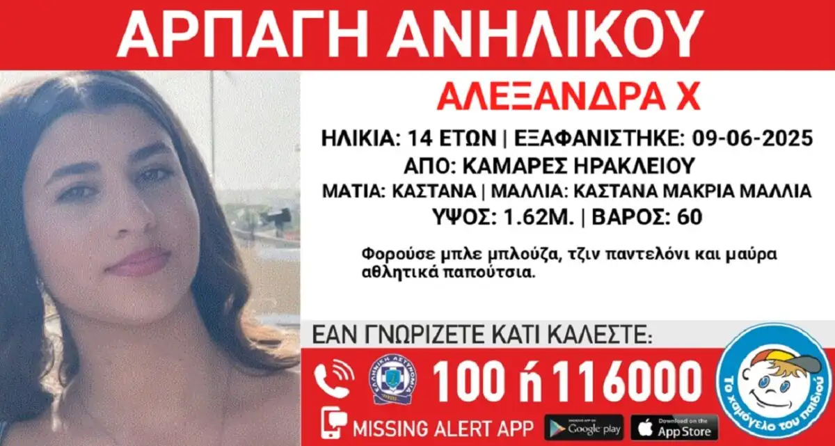 Συναγερμός στο Ηράκλειο για την εξαφάνιση της 14χρονης Αλεξάνδρας το μεσημέρι της Δευτέρας (09/06/2025) ενώ το «Χαμόγελο του Παιδιού» κάνει λόγο για αρπαγή.