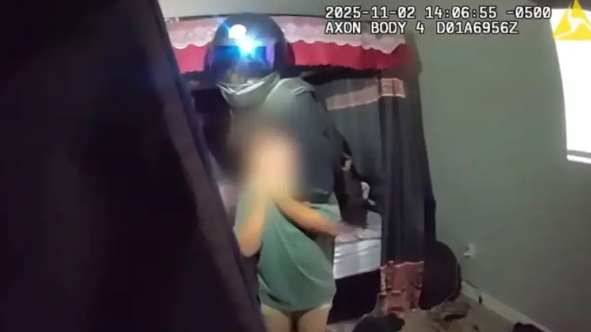 Όταν ο 27χρονος δεν υπάκουσε στις εκκλήσεις, ο αστυνομικός κλώτσησε την πόρτα για να την ανοίξει με την κάμερα να καταγράφει τον Κομάτσο που φορούσε κράνος να έχει σε κεφαλοκλείδωμα τον μικρότερο αδελφό του.