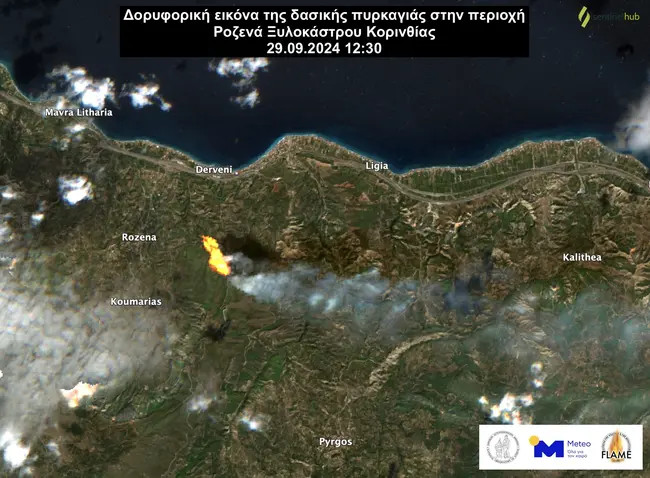 Όπως αναφέρεται σε ανάρτηση του The FLAME project, η δασική πυρκαγιά εκδηλώθηκε τις πρωινές ώρες της Κυριακής 29.09.2024 στην περιοχή Ροζενά Ξυλοκάστρου Κορινθίας όπως φαίνεται και στην παρακάτω δορυφορική εικόνα του Sentinel-2 λίγα λεπτά μετά την έναρξη της (12:30 τοπική ώρα).