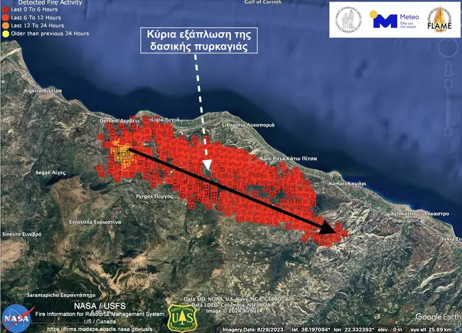 Υπό αυτές τις συνθήκες η δασική πυρκαγιά εξαπλώθηκε γρήγορα ανατολικά-νοτιοανατολικά προς την περιοχή του Ξυλόκαστρου όπως φαίνεται στην Εικόνα 2 όπου παρουσιάζονται τα θερμά σημεία που εντοπίσαν οι δορυφόροι πολικής τροχιάς έως τις πρωινές ώρες της Δευτέρας 30.09.2024.