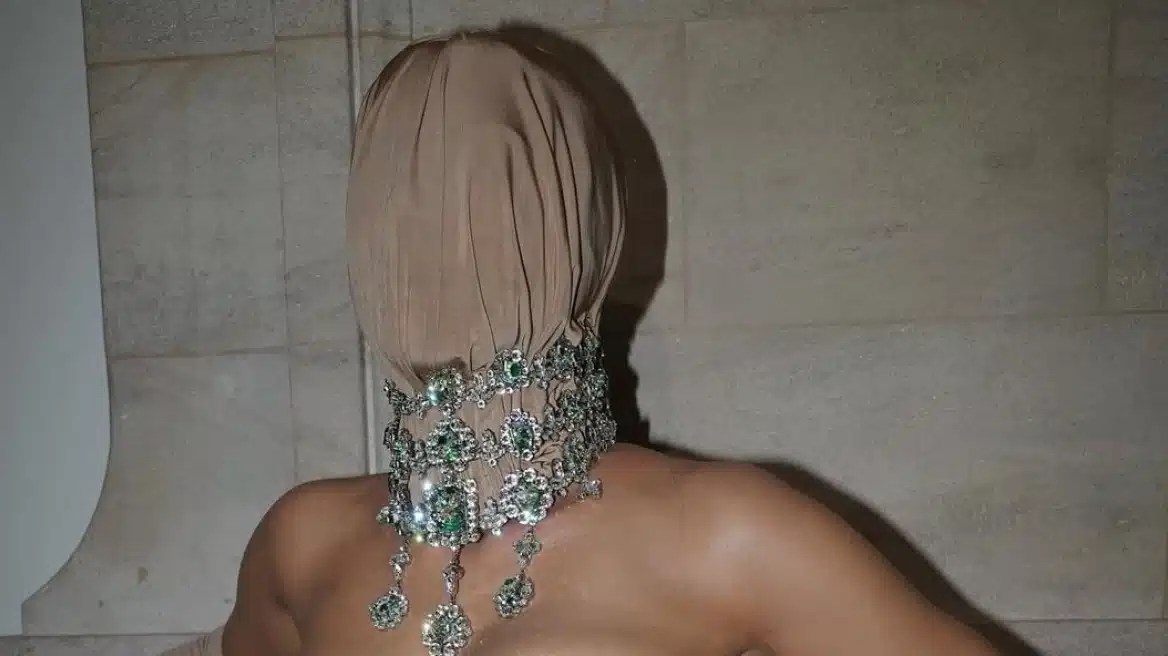 Η τηλεπερσόνα και επιχειρηματίας φόρεσε μια μάσκα σε χρώμα nude που κάλυπτε το πρόσωπό της με ένα στράπλες φόρεμα Maison Margiela με κορσέ και ντραπέ μανίκια που συνδέονταν με το τελείωμα του φορέματος.