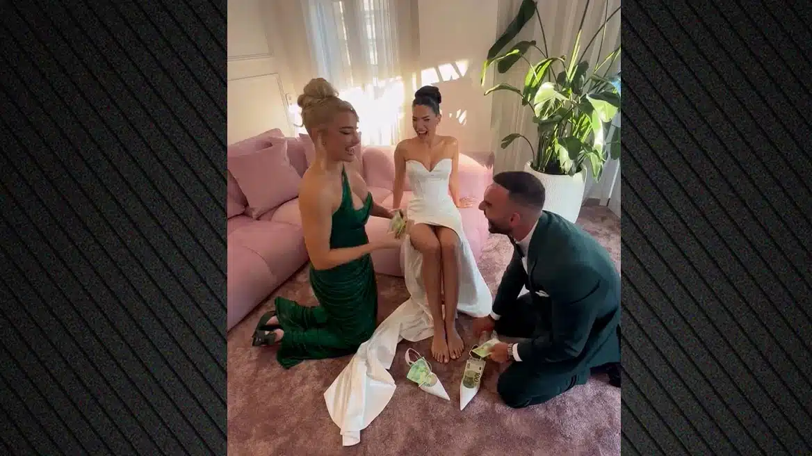 Δεν θα μπορούσε, επίσης, να λείψει το έθιμο με τα παπούτσια της νύφης που χρειάζονται… χρήματα για να της κάνουν, με την Ιωάννα Τούνη και τον έτερο κουμπάρο να βγάζουν 100ευρα από πορτοφόλια και… μπούστα για να βοηθήσουν ώστε να φτάσει η μελλονυμφη στην εκκλησία για να παντρευτεί.