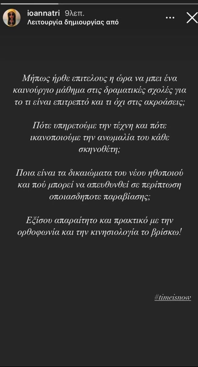 “Μήπως ήρθε επιτέλους η ώρα να μπει ένα καινούργιο μάθημα στις δραματικές σχολές για το τι είναι επιτρεπτό και τι όχι στις ακροάσεις; Πότε υπηρετούμε την τέχνη και πότε ικανοποιούμε την ανωμαλία του κάθε σκηνοθέτη; Ποια είναι τα δικαιώματα του νέου ηθοποιού και που μπορεί να απευθυνθεί σε περίπτωση οποιασδήποτε παραβίασης; Εξίσου απαραίτητο και πρακτικό με την ορθοφωνία και την κινησιολογία το βρίσκω” έγραψε χαρακτηριστικά η Ιωάννα Τριανταφυλλίδου.