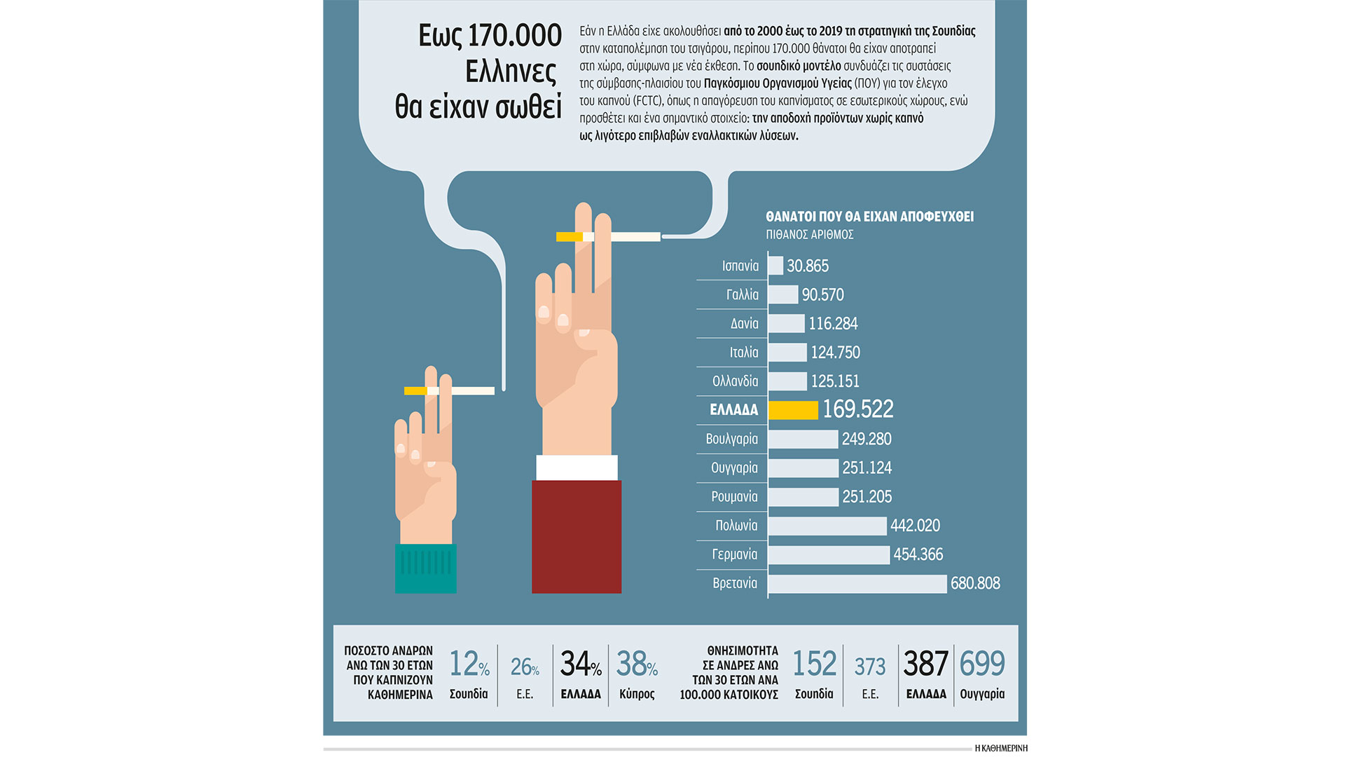Σύμφωνα με την έκθεση, η οποία πραγματοποιήθηκε από την οργάνωση Health Diplomats, έναν διεθνή οργανισμό που στοχεύει στην ενίσχυση της πρόσβασης στις υπηρεσίες υγείας, της καινοτομίας και της χρήσης πολιτικών μείωσης βλάβης και στη συρρίκνωση των αρνητικών επιπτώσεων του αλκοόλ, του τσιγάρου, των τροφίμων και των ναρκωτικών, εάν η Ε.Ε. είχε τους ίδιους δείκτες με τη Σουηδία από το 2000 έως το 2019, 2,9 εκατ. θάνατοι θα είχαν πιθανότατα αποτραπεί. Η έρευνα που αναλύει δεδομένα από 12 ευρωπαϊκές χώρες δείχνει ότι οι περισσότερες ζωές θα είχαν σωθεί στο Ηνωμένο Βασίλειο (680.000).