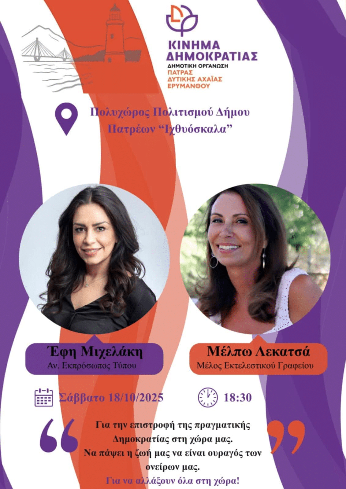 Προσκαλούμε τα μέλη , τους φίλους και τους πολίτες της Πάτρας , Δυτικής Αχαϊας και Ερυμάνθου στην Ολομέλεια της Δημοτικής Οργάνωσης Πάτρας Δυτικής Αχαΐας και Ερυμάνθου που θα πραγματοποιηθεί το Σάββατο 18/10/2025 στις 18.30 στον Πολυχώρο Ιχθυόσκαλας του Δήμου Πατρέων δίπλα στον Φάρο.
