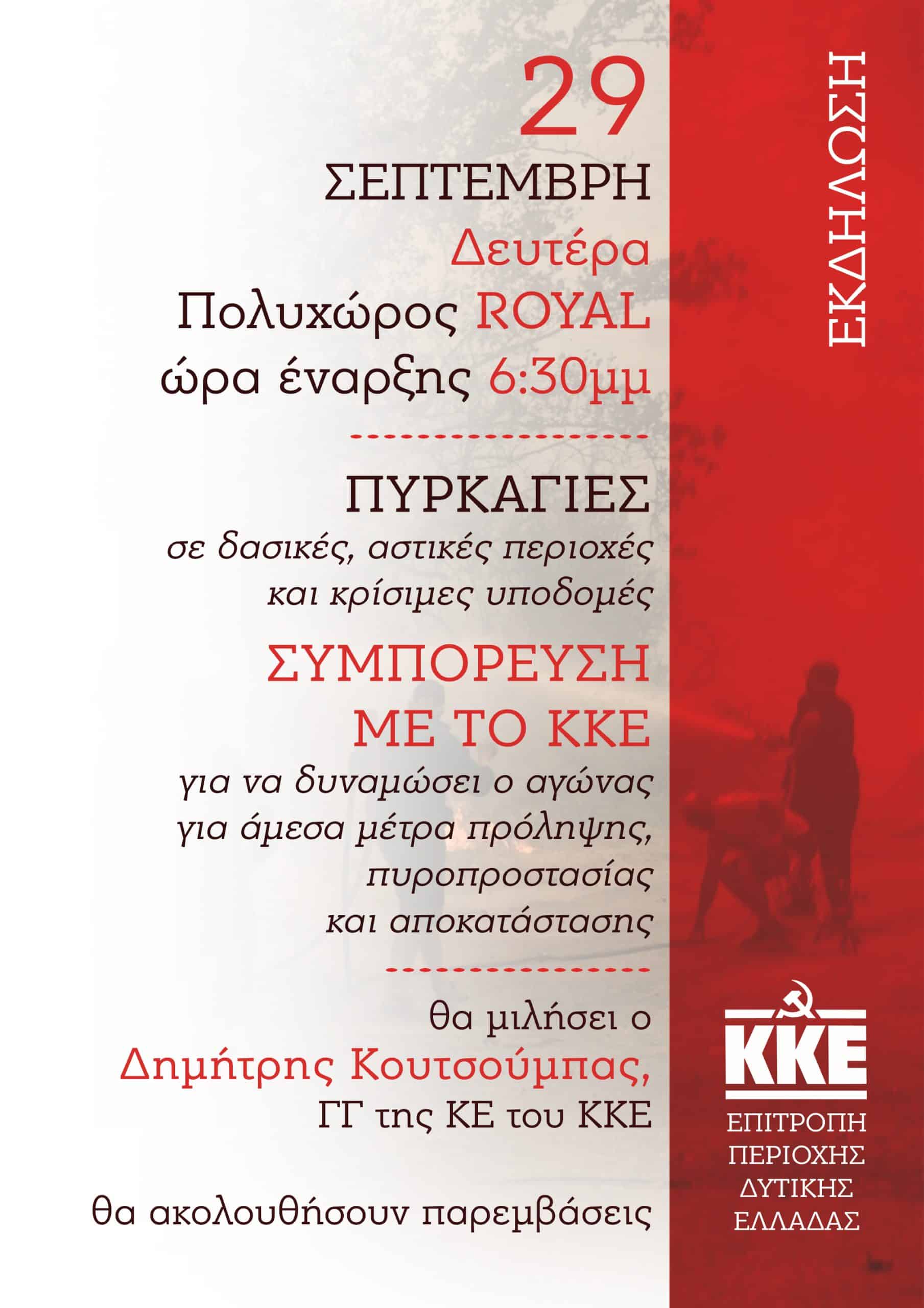 Η Επιτροπή Περιοχής Δυτικής Ελλάδας του ΚΚΕ διοργανώνει τη Δευτέρα 29 Σεπτεμβρίου, στις 18.30, στον Πολυχώρο «Royal» (Ακτή Δυμαίων 53) στην Πάτρα, εκδήλωση με θέμα: «Πυρκαγιές σε δασικές, αστικές περιοχές και κρίσιμες υποδομές. Συμπόρευση με το ΚΚΕ για να δυναμώσει ο αγώνας για άμεσα μέτρα πρόληψης, πυροπροστασίας και αποκατάστασης».