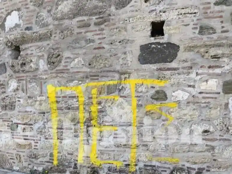 Έδρασαν όπως φαίνεται τη αργά νύχτα της Πέμπτης (08-05-2025) προς ξημερώματα Παρασκευής. Έκαναν γκράφιτι με κίτρινη μπογιά και απομακρύνθηκαν πριν φτάσουν στην περιοχή αστυνομικοί.