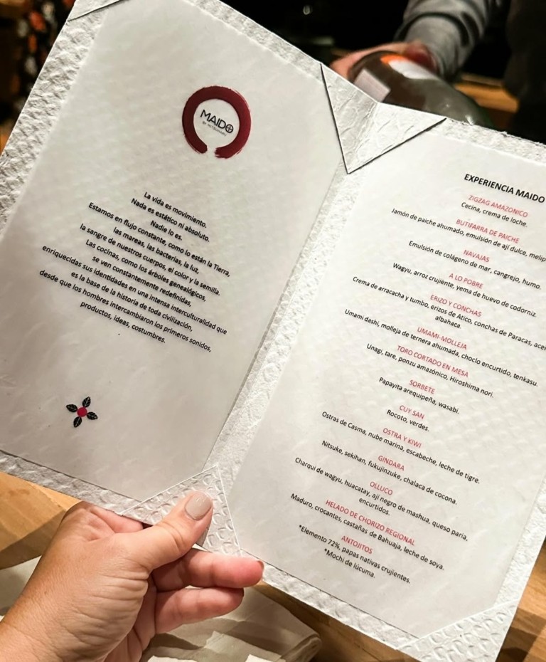 Το φαγητό στο Maido λοιπόν, είναι περισσότερο ένα ταξίδι των αισθήσεων παρά ένα γεύμα. Το μενού γευσιγνωσίας, που συνήθως περιλαμβάνει 10 έως 14 πιάτα, οδηγεί τους επισκέπτες σε ένα ταξίδι στην πολιτιστική και οικολογική κουλτούρα του Περού, όπως την ερμηνεύει η ιαπωνική μαγειρική.