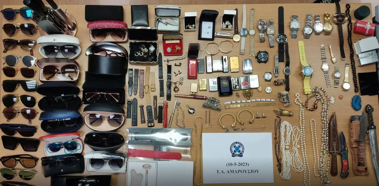Η Αστυνομία εντόπισε χθες την 46χρονη στο σπίτι της, εντός του οποίου βρισκόταν και ο 27χρονος, και μετά από έρευνα που βρέθηκαν μεταξύ άλλων και κατασχέθηκαν: 2 αυτοσχέδιες συσκευασίες που περιείχαν ναρκωτική ουσία (πιθανόν ινδική κάνναβη) συνολικού βάρους 3,6 γραμμ., αεροβόλο πιστόλι, 4 μαχαίρια, 2 ποδήλατα, πλήθος ρολογιών χειρός, πλήθος γυαλιών ηλίου, κοσμήματα, αναπτήρες, είδη ρουχισμού και τσάντες. Επίσης βρέθηκε μέρος των αφαιρεθέντων από το σπίτι στο Μαρούσι και αποδόθηκαν στο νόμιμο ιδιοκτήτη.