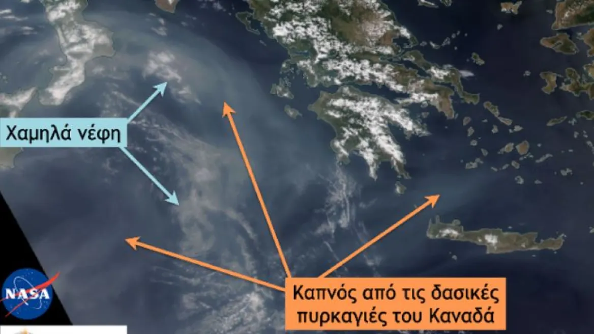 Υψηλές συγκεντρώσεις καπνού από τις φωτιές στον Καναδά στη μέση και ανώτερη τροπόσφαιρα του Ιονίου και της Κρήτης έγιναν ορατές από δορυφορικές εικόνες του αμερικανικού δορυφόρου NOAA-20 των NASA/NOAA το μεσημέρι της Παρασκευής (30/6).