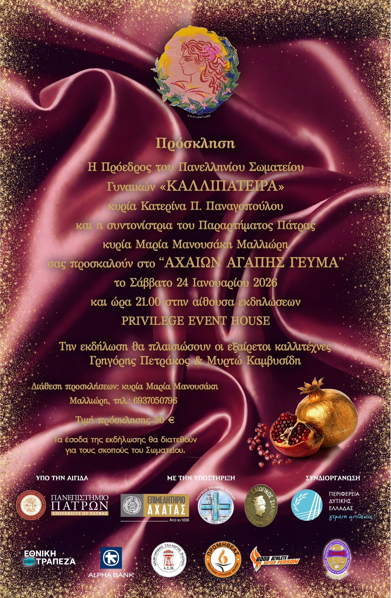 Σε μια βραδιά αφιερωμένη στην προσφορά, την αλληλεγγύη και τον πολιτισμό, το Πανελλήνιο Σωματείο Γυναικών «Καλλιπάτειρα» προσκαλεί στο «Αχαΐων Αγάπης Γεύμα», που θα πραγματοποιηθεί το Σάββατο 24 Ιανουαρίου 2026, στις 21:00, στο Privilege Event House.