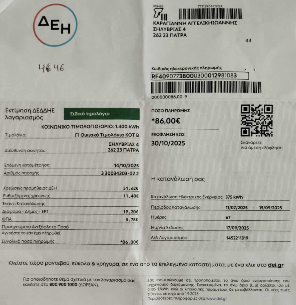 Ο πρώτος, ύψους 86 ευρώ, αφορά το δίμηνο Ιουλίου – Αυγούστου, εκδόθηκε στις 15 Σεπτεμβρίου, με ημερομηνία λήξης στις 30 Οκτωβρίου 2025.