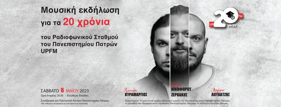 Στα πλαίσια των εορτασμών για τα 20 χρόνια αυτού του ταξιδιού, σας προσκαλούμε σε μια μουσική εκδήλωση στο Συνεδριακό & Πολιτιστικό Κέντρο του Πανεπιστημίου Πατρών, με τους τραγουδοποιούς Γιώργο Ζερβάκη, Παντελή