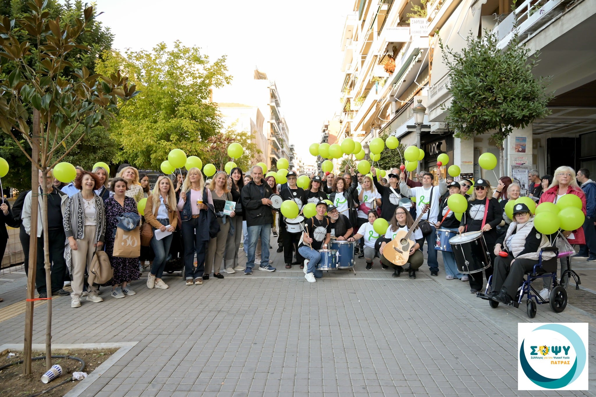 Την Παρασκευή 10 Οκτωβρίου πραγματοποιήθηκε ο Μουσικός περίπατος με μεγάλη επιτυχία. Όλοι μαζί περπατήσαμε μια διαδρομή στο κέντρο της Πάτρας από την Πλατεία Εθνικής Αντιστάσεως (πλατεία Όλγας) ως την Πλατεία Γεωργίου Α’, παίζοντας μουσική και τραγουδώντας για την ψυχική υγεία με στόχο την ενημέρωση, την ευαισθητοποίηση, την πρόληψη, την καταπολέμηση του στίγματος και την προαγωγή της ψυχικής υγείας. Αφού φτάσαμε στην Πλατεία Γεωργίου Α’ , ΟΛΟΙ ΜΑΖΙ ανάμεσα στα δύο επιβλητικά συντριβάνια της Πάτρας με θέα το Δημοτικό Θέατρο Απόλλων, σχηματίσαμε το σύμβολο της ψυχικής υγείας, την πράσινη κορδέλα, προάγοντας την ελπίδα, την ενδυνάμωση και την αποδοχή.