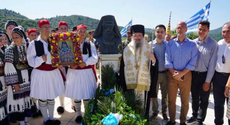 Ἐν συνεχείᾳ προέστη τῆς ἱερᾶς Λιτανείας, τῆς Εἰκόνος τοῦ Ἁγίου Γρηγορίου, ἡ ὁποία Λιτανεία, κατέληξε στόν τόπο, ὃπου ὁ Σεβασμιώτατος ἒστησε τήν προτομή τοῦ Ἁγίου (πρό τῆς ἁγιοκατατάξεώς του). Ἐκεῖ ἀνεπέμφθη δέησις καί κατετέθησαν στέφανοι.