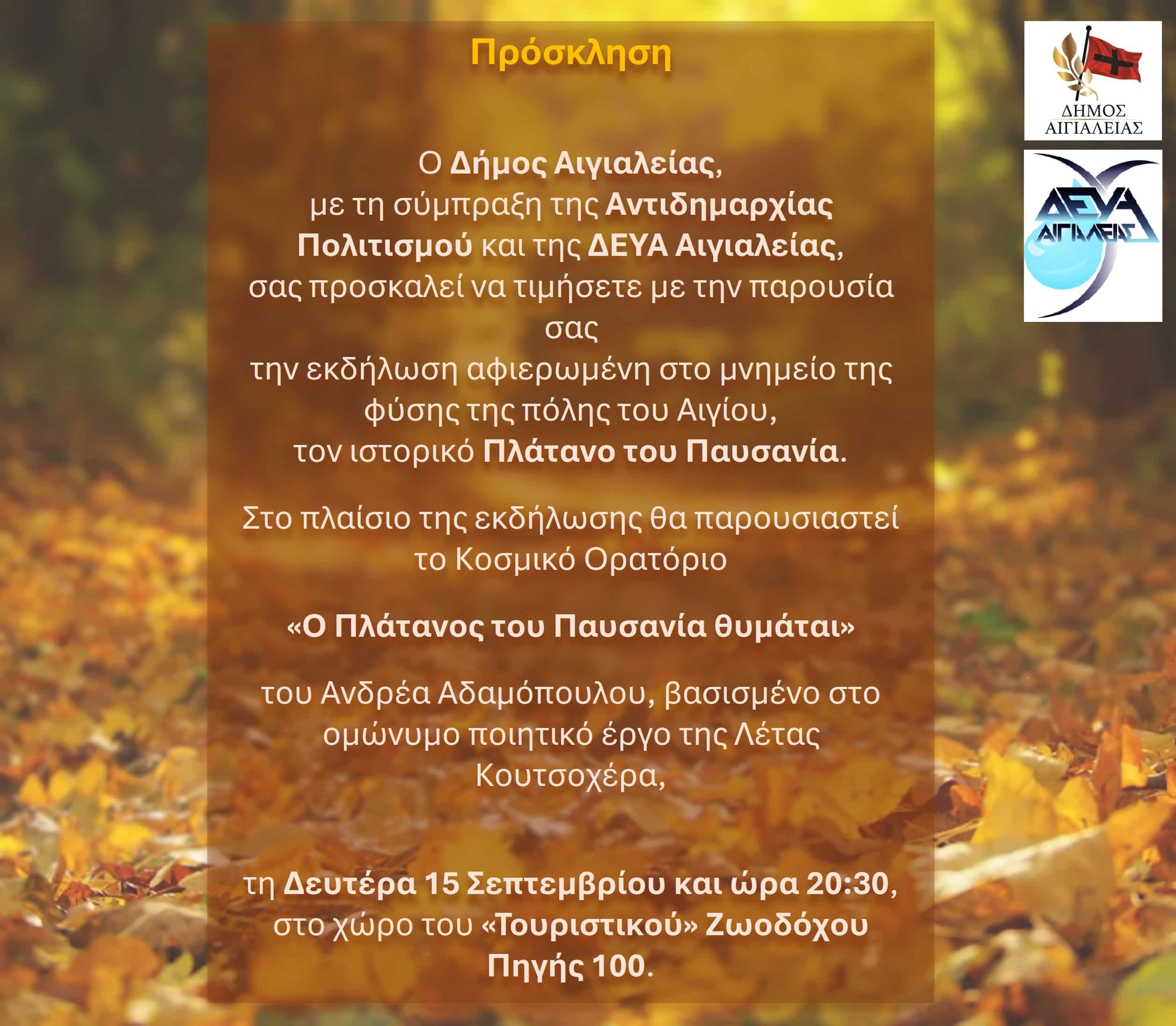 Εκδήλωση αφιερωμένη στον ιστορικό Πλάτανο του Παυσανία, το καταπληκτικό μνημείο της φύσης που κοσμεί την παραλία Αιγίου, πραγματοποιείται τη Δευτέρα 15 Σεπτεμβρίου στις 8.30 μ.μ. στον χώρο του «Τουριστικού», Ζωοδόχου Πηγής 100 στην παραλία Αιγίου, με την παρουσίαση του κοσμικού ορατορίου «Ο Πλάτανος του Παυσανία θυμάται», που συνέθεσε ο Ανδρέας Αδαμόπουλος πάνω στο ομώνυμο ποιητικό έργο της Λέτας Κουτσοχέρα.