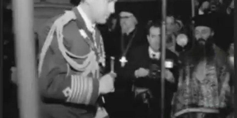 Ο Βασιλιάς Κωνσταντίνος ανταλλάσσει χειραψία με τον Π. Κανελλόπουλο και ασπάζεται την κάρα του Αγίου Ανδρέα.