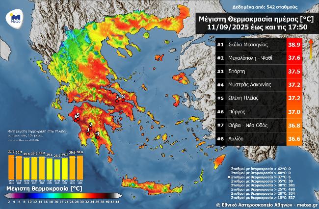 Υψηλές για την εποχή θερμοκρασίες επικράτησαν στη χώρα την Πέμπτη 11/09, με τις μέγιστες τιμές να ξεπερνούν τους 37-38°C. Σύμφωνα με το δίκτυο αυτόματων μετεωρολογικών σταθμών του Εθνικού Αστεροσκοπείου Αθηνών / meteo.gr, η υψηλότερη μέγιστη θερμοκρασία καταγράφηκε στη Σκάλα Μεσσηνίας με 38.9 °C.