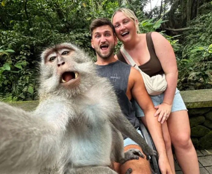 Στη φωτογραφία που ανέβασαν στον λογαριασμό τους στο Instαgram φαίνεται να είναι ο πίθηκος αυτός που τραβάει τη selfie και μάλιστα «χαμογελώντας» την ώρα που οι δύο Βρετανοί τουρίστες δείχνουν να έχουν μείνει κυριολεκτικά με το στόμα ανοιχτό.