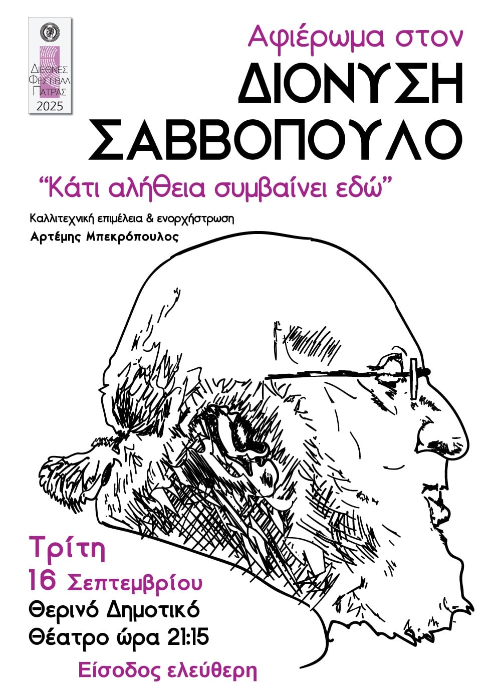 Η Αντιδημαρχία Πολιτισμού του Δήμου Πατρέων, στο πλαίσιο του Διεθνούς Φεστιβάλ Πάτρας, διοργανώνει συναυλία, αφιερωμένη στον Διονύση Σαββόπουλο. Η συναυλία θα πραγματοποιηθεί την Τρίτη, 16 Σεπτεμβρίου, στο Θερινό Δημοτικό Θέατρο, στις 9.15 μ.μ. με ελεύθερη είσοδο.