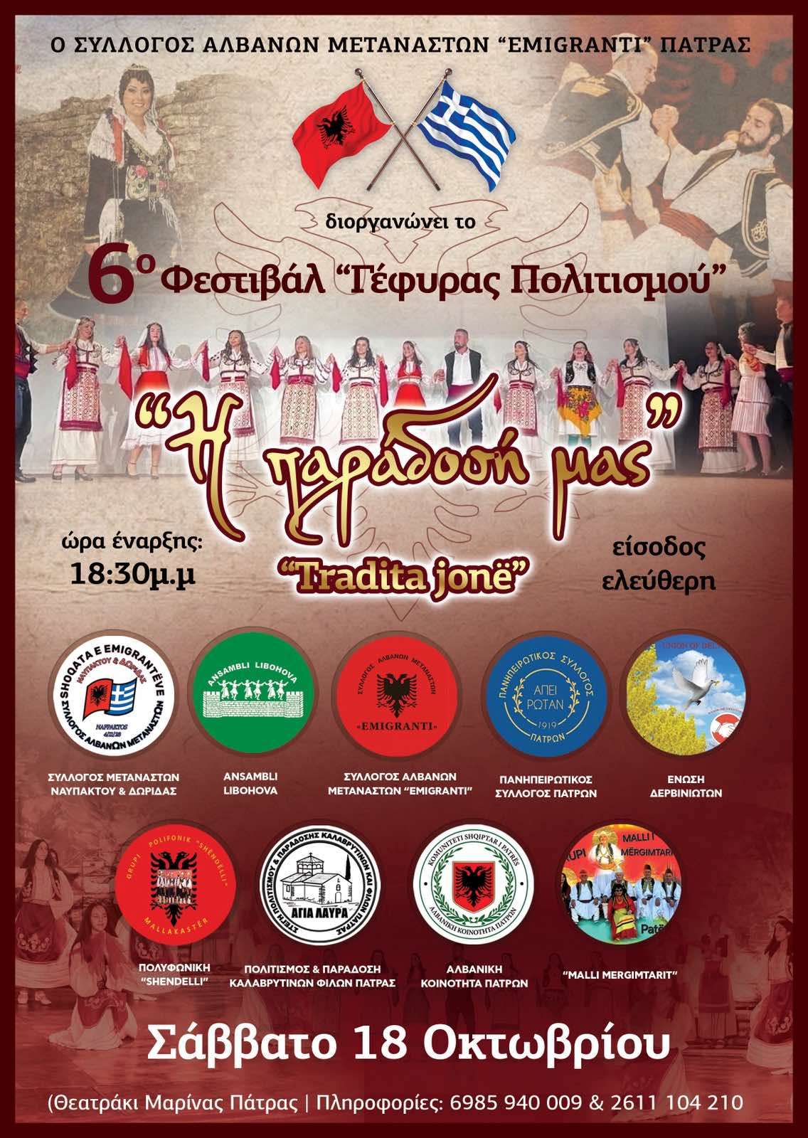 Ο Σύλλογος «Emigranti» Πάτρας με ίδρυση από το 2007, σας προσκαλεί στο 6ο φεστιβάλ της παράδοσής μας, στις 18 ΟΚΤΩΒΡΙΟΥ 2025, ώρα 19:00, στο Θεατράκι – Μαρίνας, Πάτρα, για να απολαύσετε από κοντά το άρωμα της αλβανικής και τοπικής (ελληνικής) παράδοσης, εδώ, στην καρδιά της Πελοποννήσου, όπου όπως κάθε χρόνο θα παρουσιαστούν οι αξίες μας μέσα από πολυφωνικά τραγούδια και χορούς από διάφορες περιοχές της Αλβανίας και Ελλάδας .