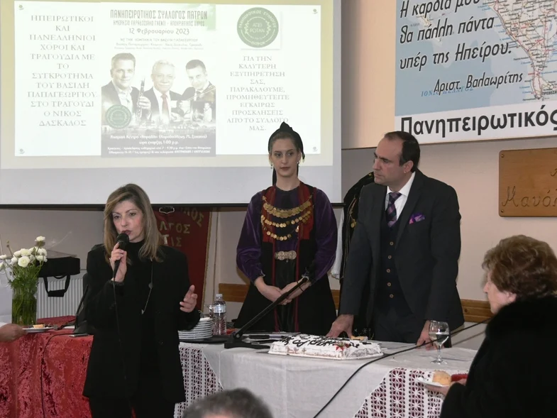 Η Αντιδήμαρχος σε σύντομο χαιρετισμό της, αρχικά ευχήθηκε καλή χρονιά στον Σύλλογο, μετέφερε τις ευχές του Δημάρχου Κώστα Πελετίδη, για υγεία και δύναμη και αναφέρθηκε στις νέες δραστηριότητες του Συλλόγου, που πλέον περνούν και στο φάσμα της κοινωνικής προσφοράς, δράσης και πολιτισμικής δημιουργίας. Μίλησε για την βαθιά εντύπωση που προκαλεί το γεγονός, ότι ο Πανηπειρωτικός Σύλλογος με ποικίλους τρόπους και δραστηριότητες, στρέφεται προς την κοινωνία, μέσω της προσφοράς, συμπαραστεκόμενος σε πάσχοντες και έχοντες ανάγκη συνανθρώπους μας. Τονώνει το συναίσθημα της αλληλεγγύης με μηνύματα στο ευρύ κοινό, αφού για να σταθεί η κοινωνία μας στην δύσκολη περίοδο που διανύουμε, επιβάλλεται η ενσυναίσθηση σε όλους.