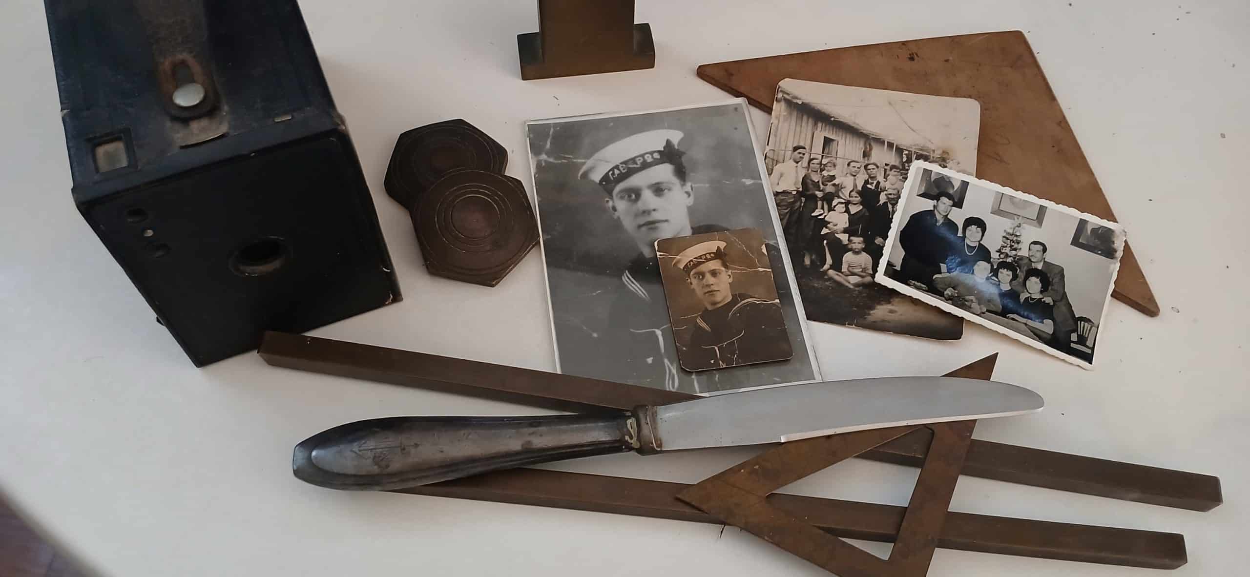 Η εξιστόρηση από πιστή απομαγνητοφώνηση διήγησης της γιαγιάς μου της Χριστίνας. Στις φωτογραφίες τα λίγα πράγματα που μας έμειναν από αυτόν: Η φωτογραφική του η Κόντακ η Μπράουνυ, οι χάρακές του, τα βαρίδια για τα χαρτιά στο σχεδιαστήριο, το μαχαίρι του από το Πολεμικό Ναυτικό όταν ήτανε φρεσκοπαντρεμένος ήδη, ναύτης στο Αβέρωφ. Στην άλλη φωτογραφία με τη γιαγιά μου τη Χριστίνα το ’33 με τη θεία μου τη Μίνα στην αγκαλιά, μωρό ακόμη. Στον ξύλινο το χάρακα, ιδιόχειρη σημείωσή του από την ίδια χρονιά. Περίπου 20 χρόνια αργότερα, όλα τα παιδιά του μαζί, με τη γιαγιά μου. Ο Κώστας, η Λία, η Μίνα, η Πία και ο Γιώργος.