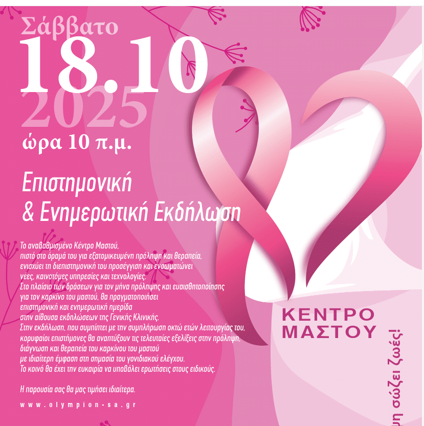 Με αφορμή τον Οκτώβριο, μήνα παγκόσμιας ευαισθητοποίησης για τον καρκίνο του μαστού, το Κέντρο Μαστού της Ολύμπιον Γενικής Κλινικής Πάτρας διοργανώνει ανοιχτή ενημερωτική εκδήλωση για το κοινό, το Σάββατο, 18 Οκτωβρίου 2025 στις 10π.μ.
