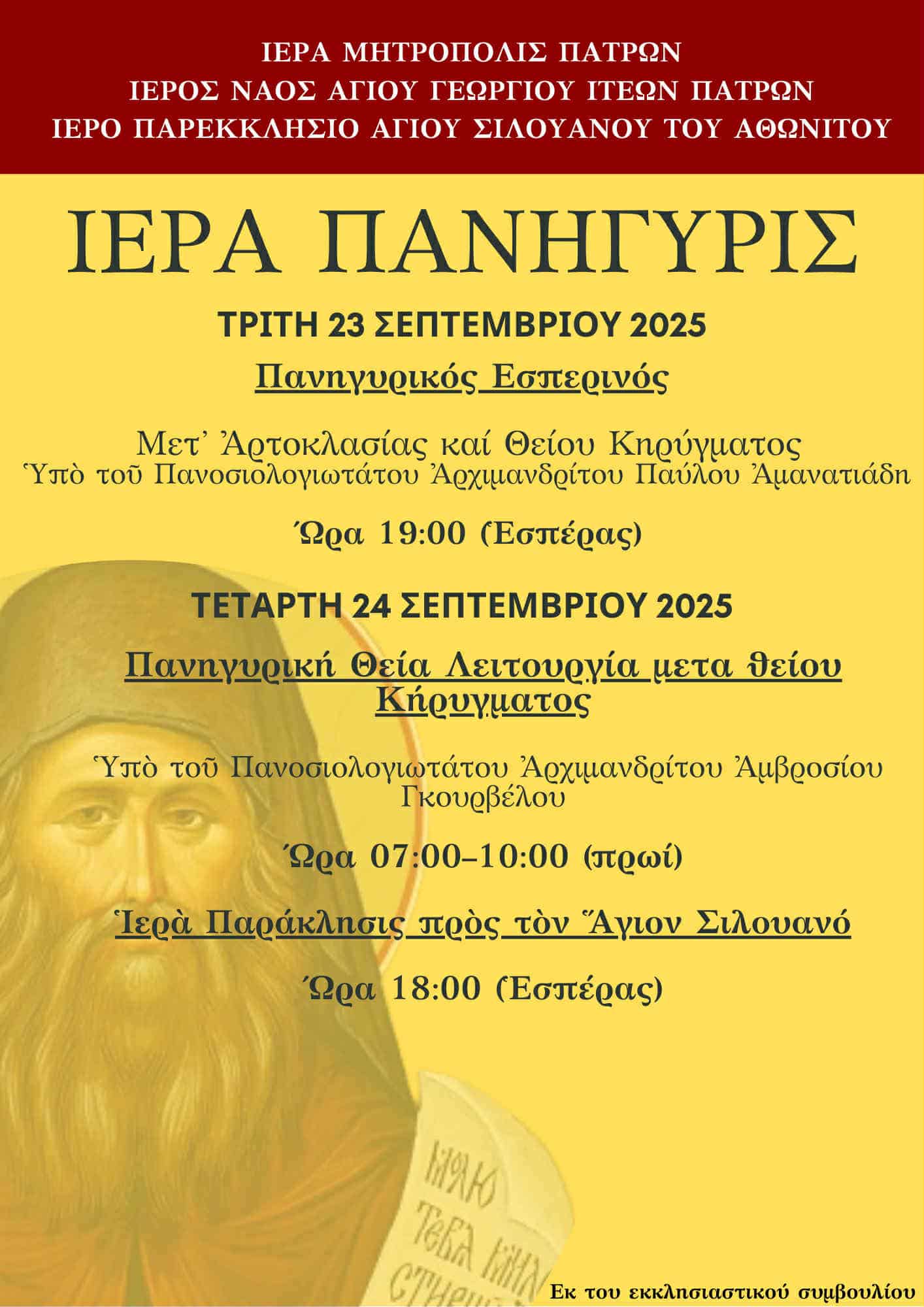 Τετάρτη 24 Σεπτεμβρίου 2025 Ώρα 07:00 – 10:00 (πρωί): Πανηγυρική Θεία Λειτουργία μετά Θείου Κηρύγματος, ιερουργούντος του Πανοσιολογιωτάτου Αρχιμανδρίτου Αμβροσίου Γκουβέλου. Ώρα 18:00 (Εσπέρας): Ιερά Παράκλησις προς τον Άγιο Σιλουανό. Η παρουσία και συμμετοχή των πιστών θα αποτελέσει ιδιαίτερη ευλογία για όλους.