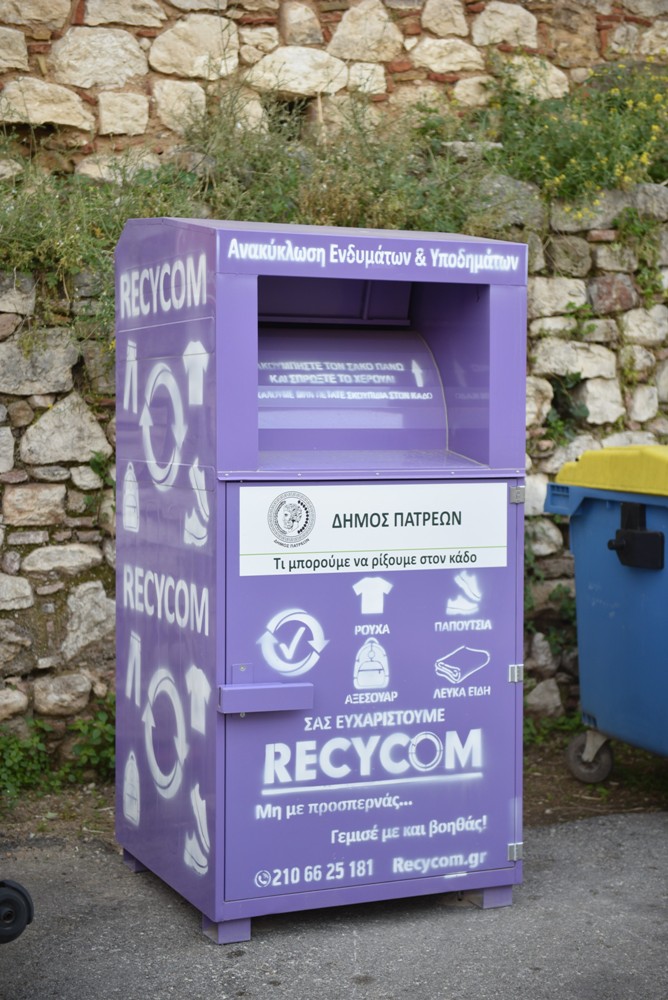 Περισσότεροι από 150 τόνοι μεταχειρισμένα ενδύματα και υποδήματα συγκεντρώθηκαν μέσα σε λίγους μήνες από τους μωβ κάδους που έχουν τοποθετηθεί σ’ όλη την Πάτρα. Το δίκτυο συλλογής μεταχειρισμένων ρούχων και υποδημάτων με «Διαλογή στην Πηγή», λειτουργεί με μεγάλη επιτυχία, ενώ οι κάδοι είναι στιβαρής μεταλλικής κατασκευής και ο σχεδιασμός της θύρας απόρριψής των υλικών δεν επιτρέπει την εξαγωγή ρούχων από το εσωτερικό του κάδου.