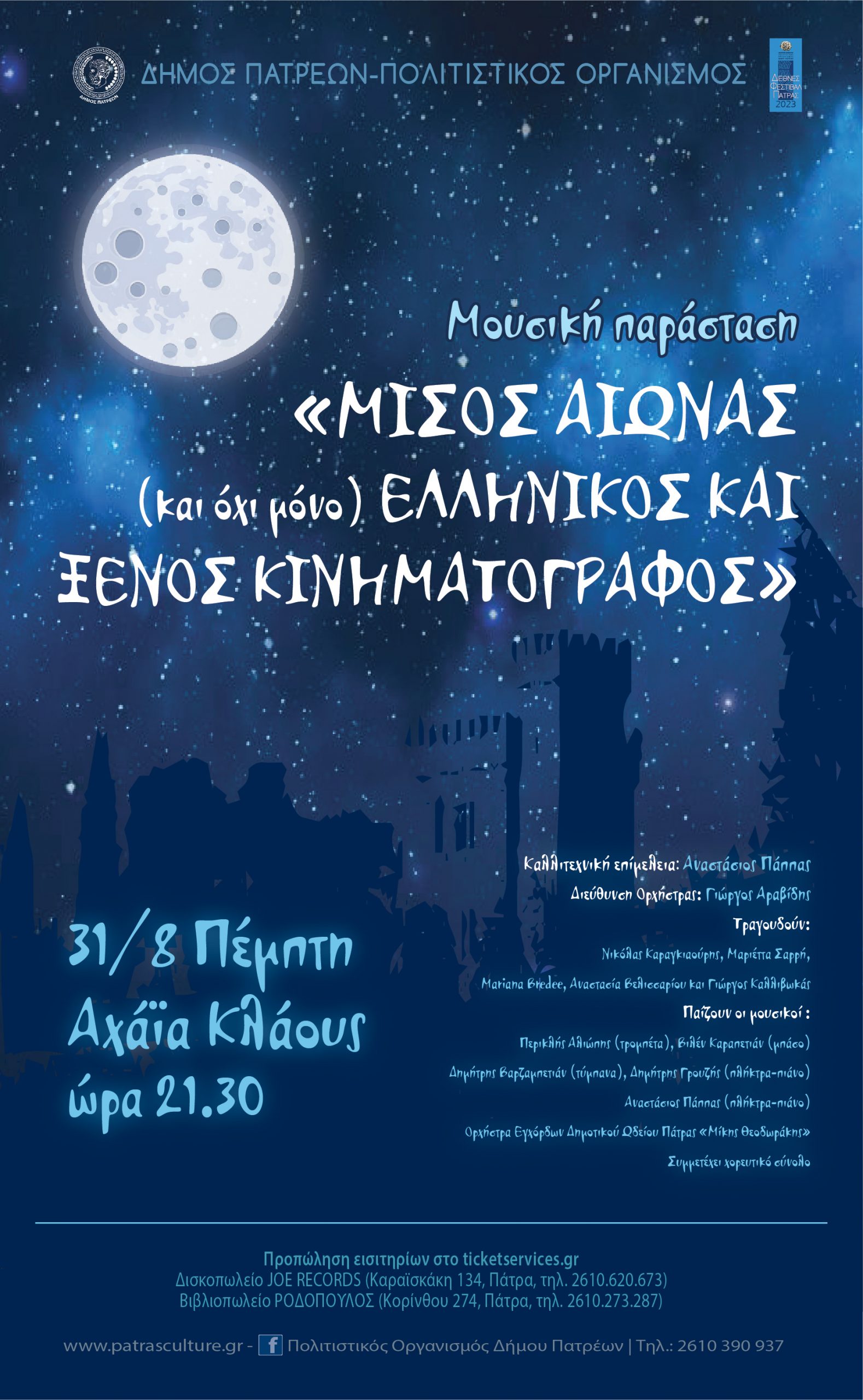 Με την μουσική παράσταση με τίτλο «Μισός αιώνας (και όχι μόνο), Ελληνικός και ξένος κινηματογράφος» θα υποδεχθεί την πανσέληνο στις 31 Αυγούστου 2023, ο Πολιτιστικός Οργανισμός του Δήμου Πατρέων, στον ειδυλλιακό χώρο της Αχάια Κλάους, στις 9.30 μ.μ.
