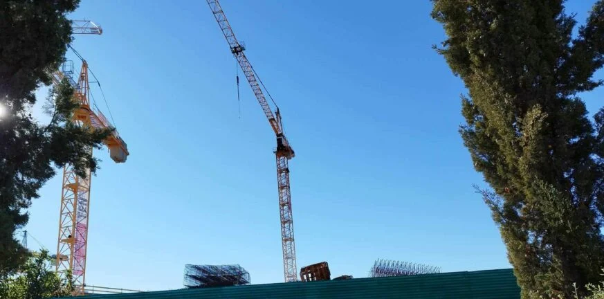 Με γοργούς ρυθμούς συνεχίζονται οι εργασίες στο εμπορικό κέντρο που χτίζεται στο πρώην εργοστάσιο της ΑΒΕΞ στη συμβολή των οδών Ακτής Δυμαίων και Ανθείας, στην Πάτρα, με τα κτίρια να φαίνονται από τον δρόμο.