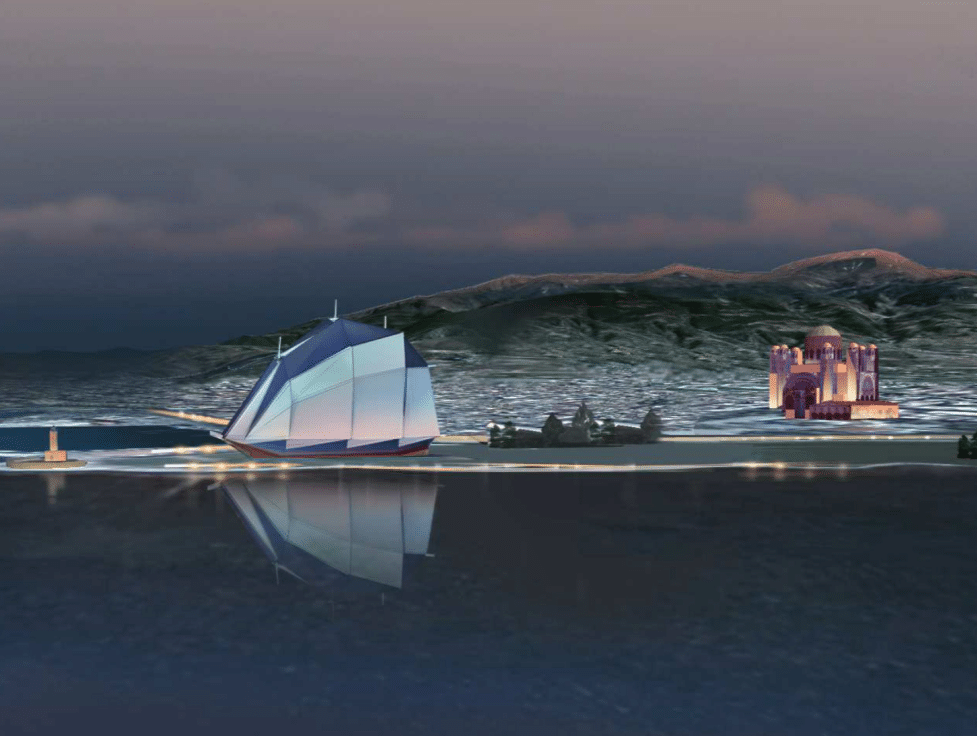 Η Αρχιτεκτονική µελέτη προβλέπει κτίριο σε σχήµα Πλοίου, απόλυτα εναρµονισµένο µε τον χαρακτήρα του έργου.