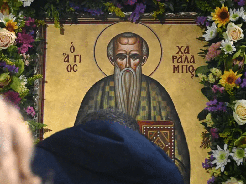 Κάποτε τον Άγιο Χαράλαμπο τον επiσκέφθησαν χωρικοί που εγκατέλειψαν την πατρίδα τους κι’ έτρεξαν κοντά του γιατί η πανώλης τους θέριζε καθημερινώς.