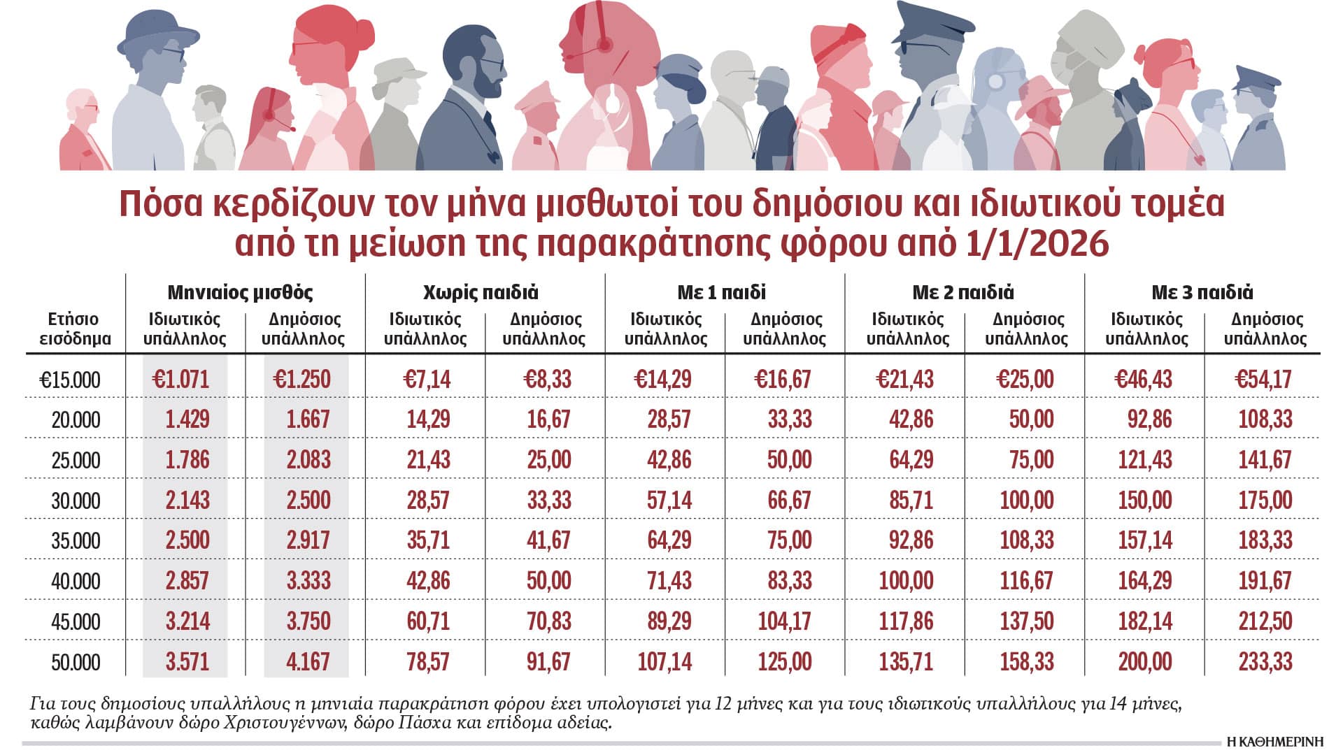 • Ενας μισθωτός με 2 τέκνα και ετήσιο φορολογητέο εισόδημα 30.000 ευρώ (1.776 ευρώ καθαρά) θα έχει μείωση φόρου 1.200 ευρώ, που ισοδυναμεί με τα δύο τρίτα ενός καθαρού μισθού.