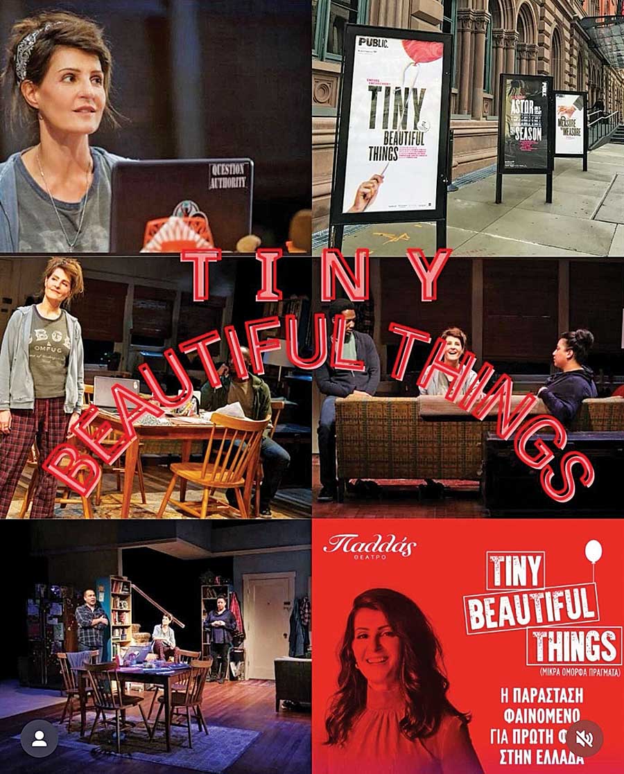 Το «Tiny Beautiful Τhings» (Μικρά όμορφα πράγματα) είναι η θεατρική διασκευή που έχει κάνει η ίδια στο ομώνυμο μυθιστόρημα της Cheryl Strayed, την οποία ανέβασε σε σκηνές στη Νέα Υόρκη και στο Λος Αντζελες. «Και τώρα αρχίζουν οι πρόβες για το ‘‘Tiny Beautiful Things’’ στην Αθήνα. Είμαι ενθουσιασμένη και τρομοκρατημένη που θα παίξω για πρώτη φορά στα ελληνικά πάνω στη σκηνή.