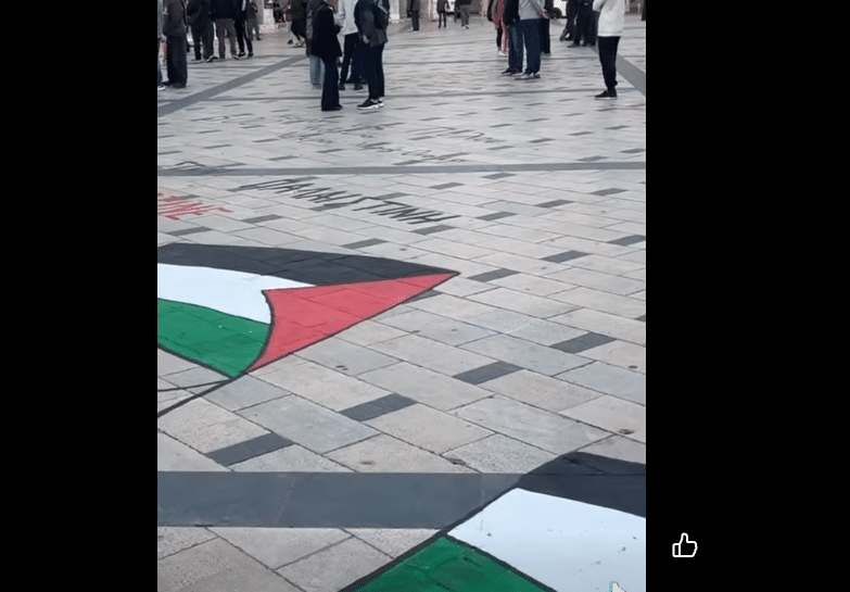 Δύο σημαίες της Παλαιστίνης ζωγράφισαν διαδηλωτές που έκαναν συγκέντρωση στην Πλατεία Γεωργίου, στα πλακάκια της πλατείας. Το βίντεο ανέβηκε στο tik tok και τα σχόλια όπως αναμένεται ποικίλλουν! ΑΛλοι συμφωνούν με την ενέργεια και άλλοι διαφωνούν! Σε ορισμένες δε περιπτώσεις οι διαφωνίες γίνονται και… διαξιφισμοί με διάφορους “χαρακτηρισμούς”…