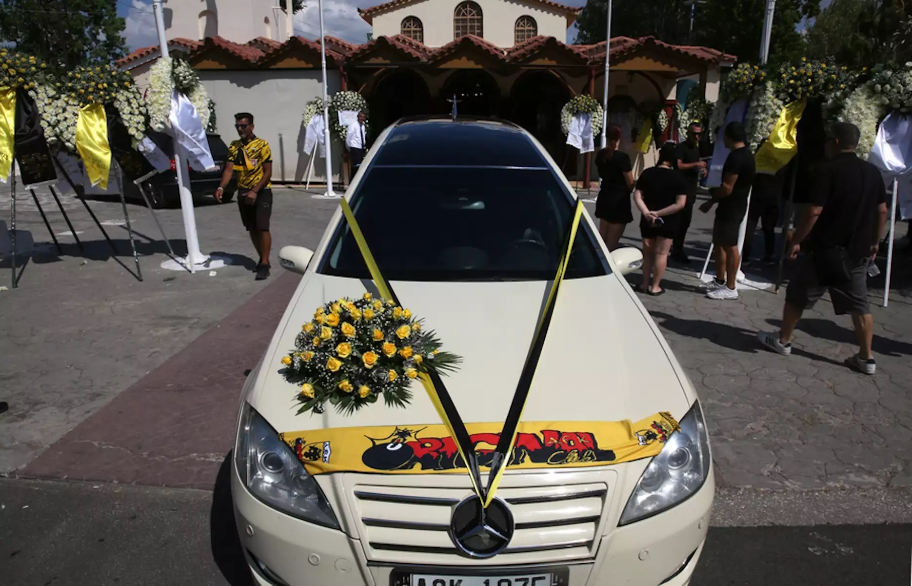 Η νεκροφόρα που μετέφερε τη σορό του 29χρονου φέρει κιτρινόμαυρες κορδέλες.