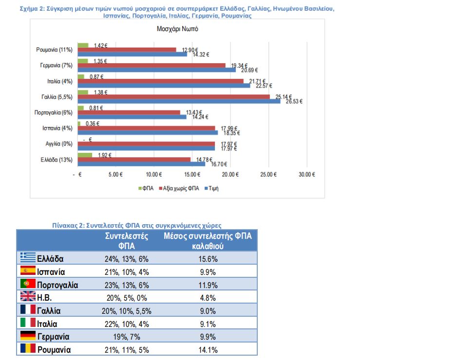 Χαρακτηριστικό της επίδρασης του ΦΠΑ στις τελικές τιμές είναι το παράδειγμα της τιμής στο Νωπό Μοσχάρι. Μάλιστα η Ελλάδα έχει μία από τις χαμηλότερες τιμές ανάμεσα στις 9 χώρες (μόνο η Πορτογαλία και η Ρουμανία καταγράφουν χαμηλότερη τιμή), αλλά συγχρόνως έχει τον υψηλότερο ΦΠΑ ανάμεσα στις 9 χώρες, καθώς είναι η μόνη χώρα μαζί με τη Ρουμανία η οποία έχει το μοσχάρι στον μεσαίο συντελεστή ΦΠΑ και όχι στον χαμηλό. Όπως φαίνεται και στον πίνακα 2, η Ελλάδα καταγράφει με διαφορά τον υψηλότερο μέσο συντελεστή ΦΠΑ για το καλάθι των 40 κατηγοριών ανάμεσα στις 9 χώρες με 15,6%, ενώ το Ηνωμένο Βασίλειο τον χαμηλότερο με 4,8% (με πολλά προϊόντα στον μηδενικό συντελεστή), και τις περισσότερες χώρες να κινούνται στην περιοχή του 9-10%.