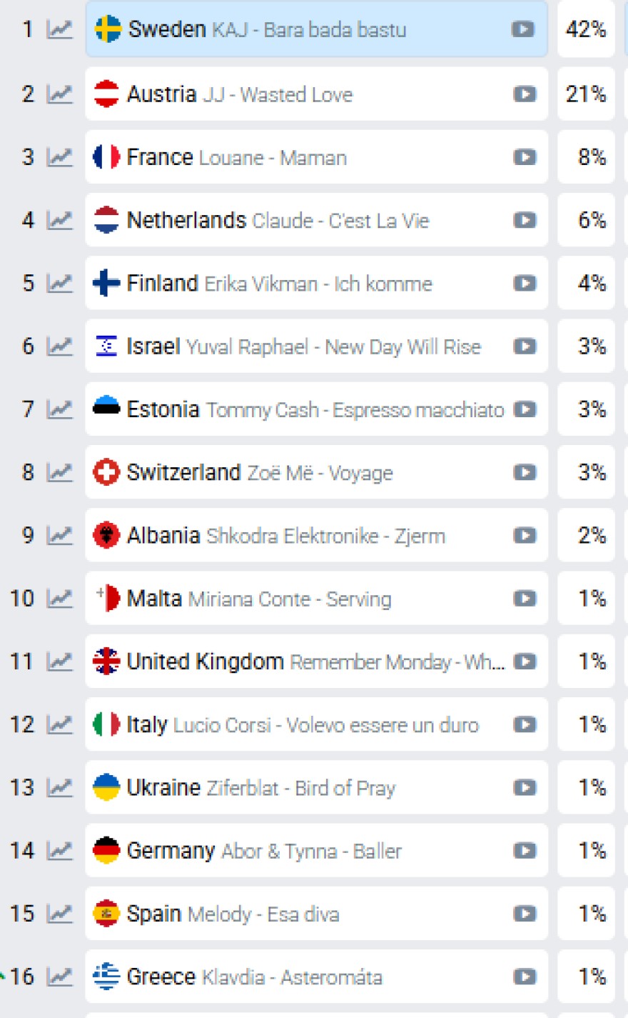 Όσον αφορά στην Ελλάδα, μέχρι στιγμής τα προγνωστικά τη θέλουν στην 16η θέση, ενώ τις προηγούμενες ημέρες βρισκόταν στην 22η. Στην τελευταία θέση των στοιχημάτων, βρίσκεται η Αρμενία με τον Parg και το τραγούδι Survivor.